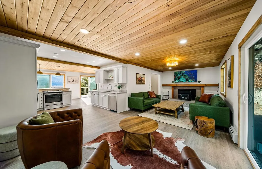 Epic Mountainside Cabin W/ Animas Views & Hot Tub features an equipped kitchen fitted with an electric kettle, a refrigerator, and kitchenware.